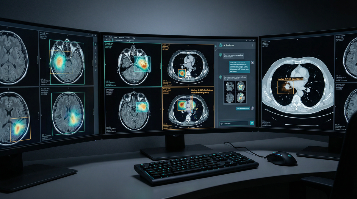 Highlights regions of interest, prioritizes worklists by urgency, and provides structured reporting assistance.